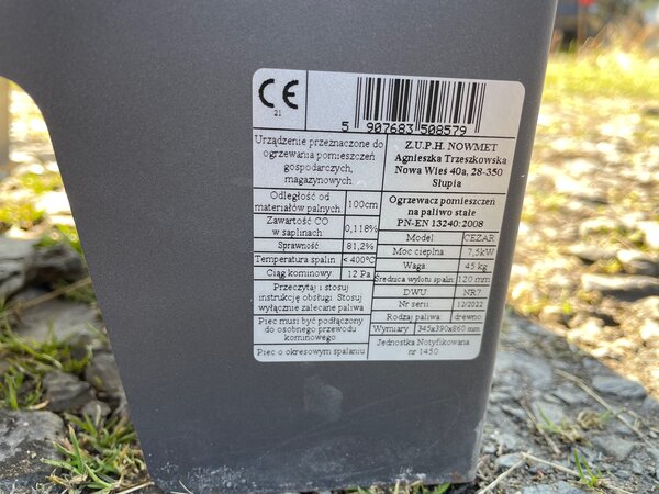 Rozměry 340mmx340mmx770mm, průměr kouřovodu 120mm, váha 45kg